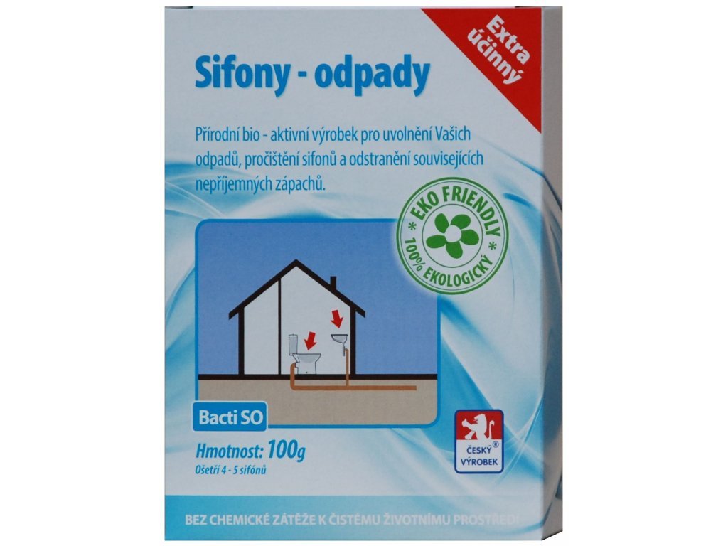 Bacti SO je zcela přírodní a ekologický vysoce účinný biologický prostředek. Je určen k uvolnění a zprůchodnění ucpaného a zaneseného odpadního potrubí a sifonu. Při jeho používání dochází k odstranění nepříjemného zápachu vycházejícího ze sifonu nebo odpadního systému. Při pravidelném používání Bacti SO je ošetřováno celé odpadní potrubí.