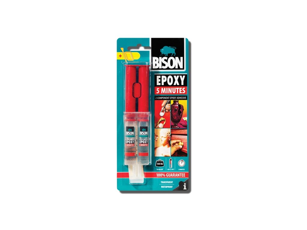 Dvousložkové epoxidové lepidlo pro lepení a opravy. Odolává vlhkosti, olejům, rozpouštědlům, ředěným kyselinám a louhům. Má tepelnou odolnost od -40°C do +100°C. Otevřená doba zpracování 5 minut. Manipulační pevnost po 20 minutách v závislosti na teplotě. Vytvrzení po 24 hodinách. Lepidlo vyplňuje spáry a po zatvrdnutí jej lze přetírat. Rozsah použití: Je vhodné pro lepení kovů, dřeva, dřevotřísky, termosetů, tvrdého PVC, laminátů, keramiky, porcelánu, skla, betonu, kamene, mramoru, gumy, pěnového polystyrenu, některých umělých hmot (umakart, polyester, bakelit) aj. a to jak mezi sebou, tak i navzájem. Není vhodné pro lepení PP, PE, teflonu a silikonu. Návod k použití: Lepené části musí být čisté, suché a odmaštěné. Odstraňte červený uzávěr mezi písty. Odlomte koncovou část hubic.Vytlačte dostatečné množství a dobře promíchávejte, dokud nezískáte stejnoměrné zabarvení. Otevřená doba zpracování je 5 minut. Lepidlo naneste jednostranně, u drsných a porézních materiálů oboustranně, oba povrchy přitlačte k sobě a zafixujte (pomocí svorek nebo pásky). Konce řádně očistěte a uzavřete (uzávěr je nutné vylomit z pístů dvoustříkačky). Minimální pracovní teplota je 15°C. Skladujte v suchu a chladu. Upozornění: Uchovávejte mimo dosah dětí. Při zasažení očí okamžitě důkladně vypláchněte vodou a vyhledejte lékařskou pomoc. Při styku s kůží okamžitě důkladně omyjte velkým množstvím mýdla a vody. Při požití nevyvolávejte zvracení a okamžitě vyhledejte lékařskou pomoc. Používejte vhodné ochranné rukavice a brýle. Nevylévejte do kanalizace. Obsahuje: Plnidlo: epoxidová pryskyřice (m.h. ? 700) < 100 % Tvrdidlo: 3-Azapentan-1,5-diamin 2,5-10%