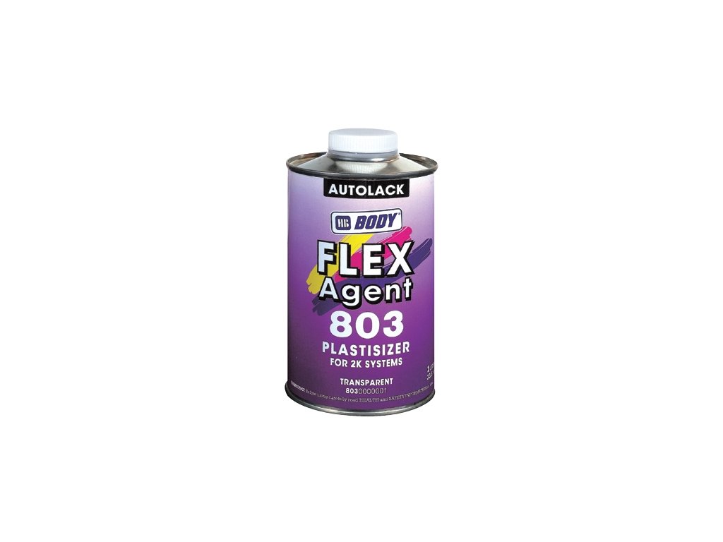 Body 803 flex agent chharakteristika: Transparentní změkčovadlo pro 2K systémy při aplikaci na plastové díly. plechovka 1L Použití: Vhodné zejména do plničů 3+1, 4+1, 5+1 a 2K barev jako je BODYCRYL a laků MS+, MS RAPID, EXPRES a HS Likvidace odpadu: Obal odevzdejte ve sběrně nebezpečného odpadu! Příklad nátěrového postupu, aplikace výrobku: Před použitím dobře promíchejte obsah plechovky. Přidejte 5% BODY 803 do základových barev nebo plničů a 15% do vrchních emailů , 2K barev a laků. Poté přidejte tužidlo a ředidlo. Dobře promíchejte. Zdrsňete plastový povrch na který se bude aplikovat barva pomocí SCOTCH BRITE a očistěte ANTISILEM. Naneste jednu nebo dvě tenké vrstvy. Upozornění: Nadměrná tloušťka suchého filmu nepříznivě ovlivňuje přilnavost.