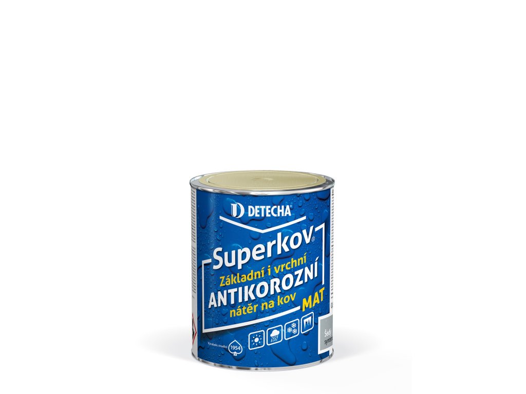 Superkov mat základní i vrchní antikorozní syntetická nátěrová hmota určená k povrchové úpravě kovových materiálů a k jejich účinné ochraně proti vzniku koroze, vhodná na na kov, plechové střešní krytiny, ocelové konstrukce, okapy apod.