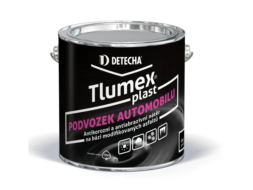 Detecha Tlumex Plast je kvalitní antikorozní a antiabrazivní nátěr vyrobený na bázi disperze syntetických pryskyřic a inhibitoru koroze. Je určený k ochraně spodních částí karoserie a podvozku automobilu a lepenkové střešní krytiny.