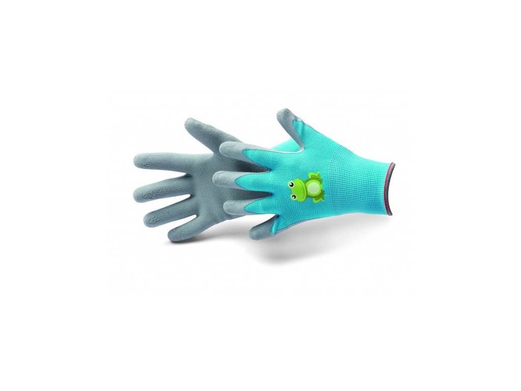 Dětské zahradní rukavice z jemného úpletu s latexovou pěnovou úpravou a zvrásněným povrchem.