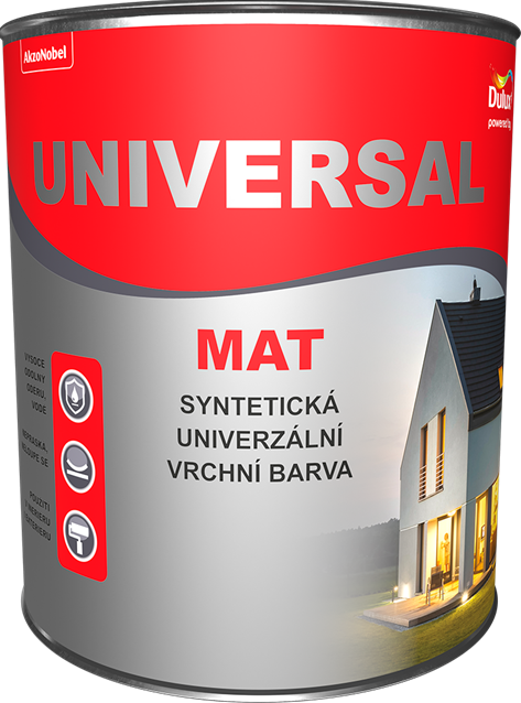 Universal mat je syntetická vrchní barva na dřevo i kov, vysoce odolná proti působení vody a vůči mechanickému poškození nátěru. Barva se lehce zpracovává a je určená k všestrannému použití v interiéru i exteriéru.