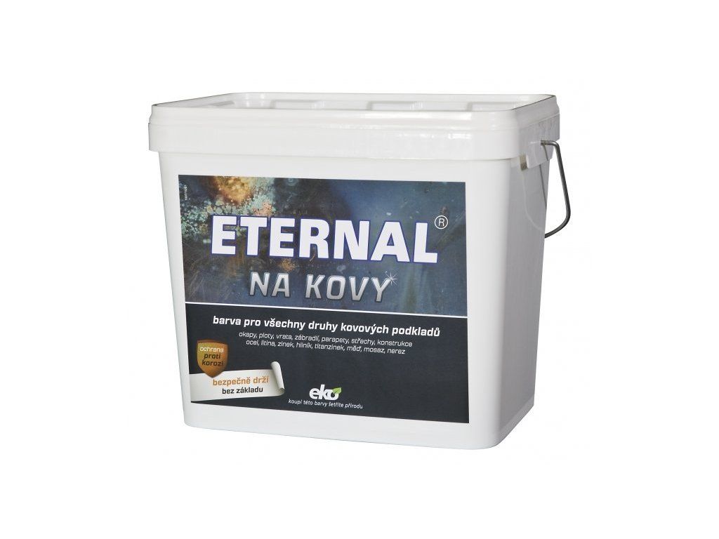 Eternal na kovy je vodou ředitelná samozákladující nátěrová hmota k přímému použití na kovové podklady na bázi disperze modifikované akrylátové pryskyřice, speciálních antikorozních pigmentů, plniv a aditiv upravujících vlastnosti. Vyznačuje se vysokou adhezí na kovových podkladech a to i na zinku, lehkých kovech a antikorozních ocelích, zvýšenou ochranou proti korozi, vysokou odolností UV záření a povětrnostním vlivům. Eternal na kovy je určen pro základní i vrchní nátěry kovových konstrukcí, stožárů, vnějších povrchů nádrží, potrubí, plotů, zábradlí, plechové krytiny, trubek, plechů, a dalších kovových výrobků z oceli, litiny, zinku, antikorozních ocelí, hliníku, mědi, mosazi i v prostředí s vyšším korozním zatížením. Spotřeba: 0,12 - 0,17 kg/m2 (1 vrstva) Balení: 0,7 kg - plechovky, 5 kg a 10 kg - plastové obaly Zpracování: Eternal na kovy se nanáší na připravený kovový podklad štětcem, válečkem, vzduchovým nebo bezvzduchovým stříkáním při teplotě podkladu i prostředí nejméně 10 °C v 1 - 3 vrstvách s přestávkou mezi nátěry min. 4 hodin /20°C/ tak, aby celková spotřeba byla 0,30 – 0,36 kg/m2. Nátěry ocelových podkladů je třeba provádět v suchém prostředí. Za chladného počasí je vhodné provést nejprve jeden velmi tenký nátěr tak, aby rychle zaschl.