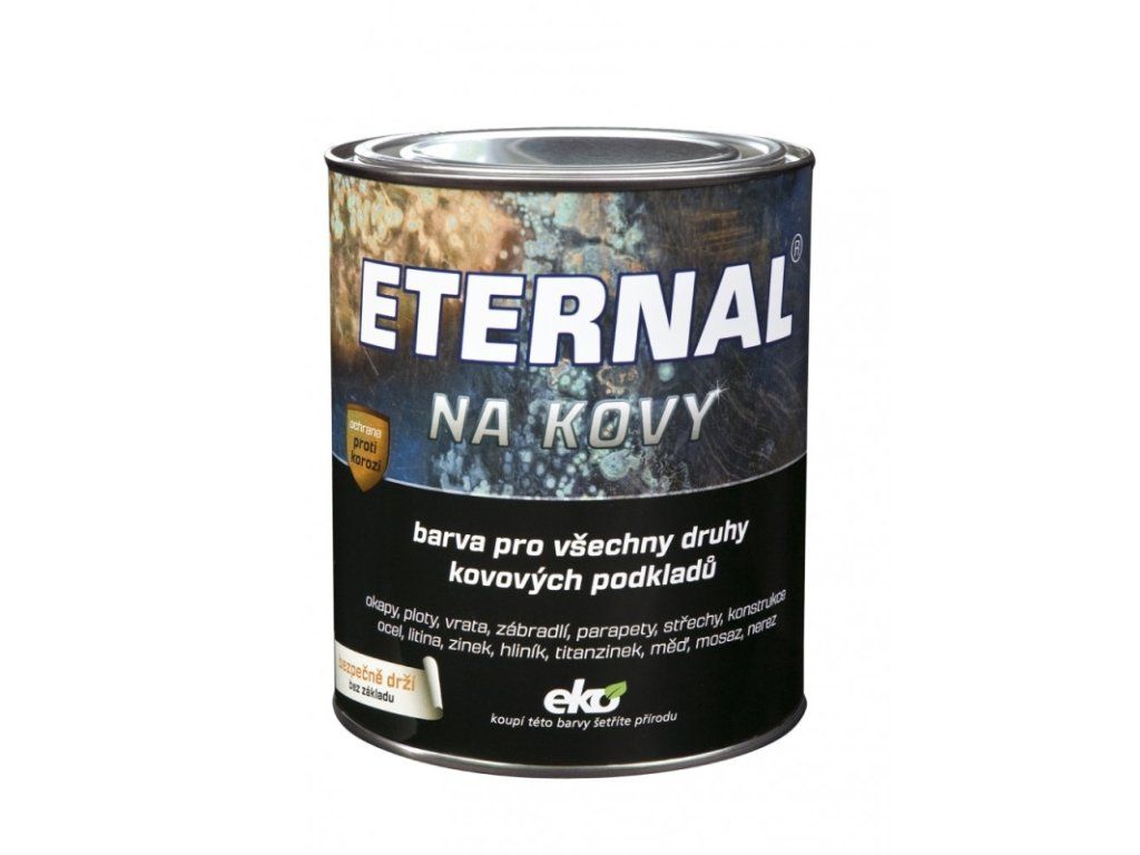 Eternal na kovy je vodou ředitelná samozákladující nátěrová hmota k přímému použití na kovové podklady na bázi disperze modifikované akrylátové pryskyřice, speciálních antikorozních pigmentů, plniv a aditiv upravujících vlastnosti. Vyznačuje se vysokou adhezí na kovových podkladech a to i na zinku, lehkých kovech a antikorozních ocelích, zvýšenou ochranou proti korozi, vysokou odolností UV záření a povětrnostním vlivům. Eternal na kovy je určen pro základní i vrchní nátěry kovových konstrukcí, stožárů, vnějších povrchů nádrží, potrubí, plotů, zábradlí, plechové krytiny, trubek, plechů, a dalších kovových výrobků z oceli, litiny, zinku, antikorozních ocelí, hliníku, mědi, mosazi i v prostředí s vyšším korozním zatížením. Spotřeba: 0,12 - 0,17 kg/m2 (1 vrstva) Balení: 0,7 kg plechovky, 5 kg plastové obaly Zpracování: Eternal na kovy se nanáší na připravený kovový podklad štětcem, válečkem, vzduchovým nebo bezvzduchovým stříkáním při teplotě podkladu i prostředí nejméně 10 °C v 1 - 3 vrstvách s přestávkou mezi nátěry min. 4 hodin /20°C/ tak, aby celková spotřeba byla 0,30 – 0,36 kg/m2. Nátěry ocelových podkladů je třeba provádět v suchém prostředí. Za chladného počasí je vhodné provést nejprve jeden velmi tenký nátěr tak, aby rychle zaschl.