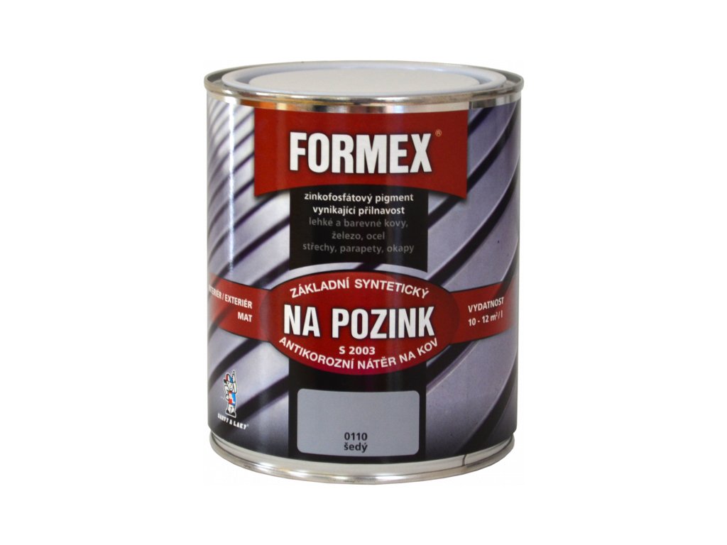 FORMEX ZÁKLAD NA POZINK S2003, barva je určena k základním nátěrům lehkých barevných kovů a železa. Je vhodný i pro nátěry oceli pod emaily nitrocelulózové a syntetické na vzduchu schnoucí. Vyznačuje se rychlým zasycháním.