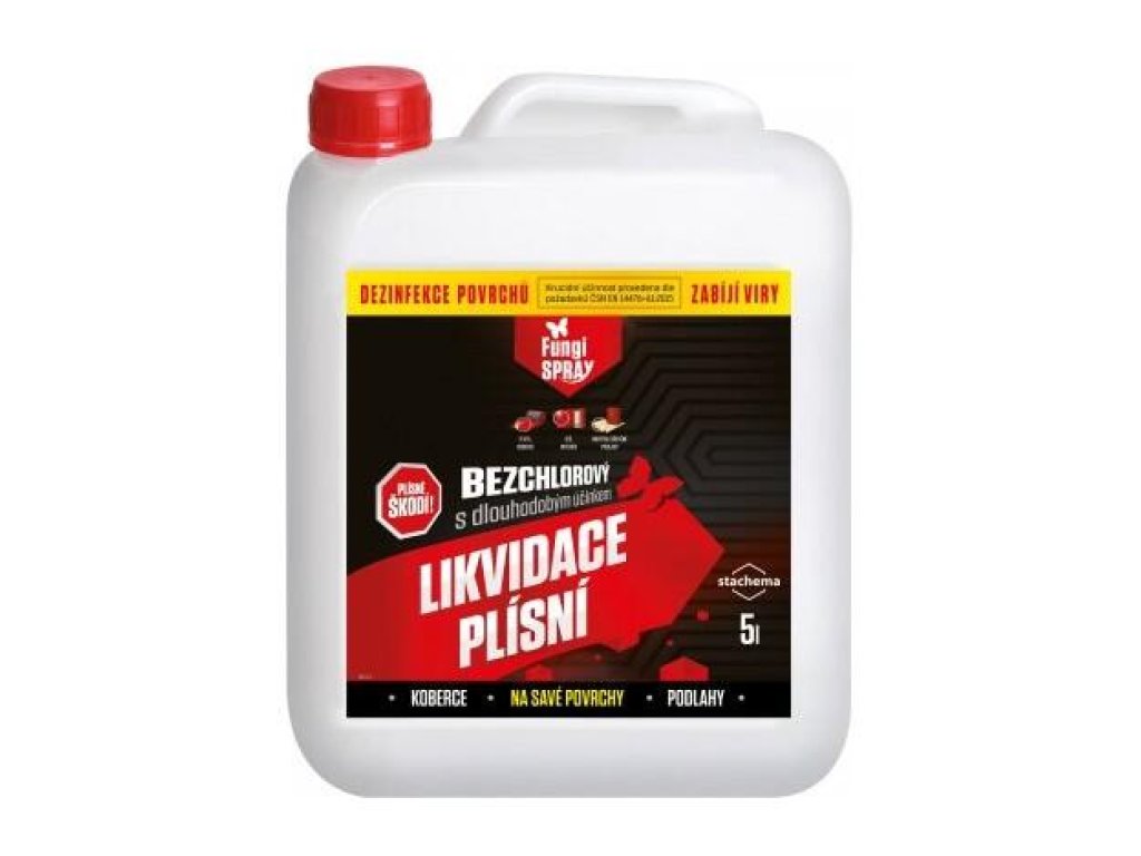 namočeným v tomto přípravku). Při silném napadení plísní je nutno postup opakovat. Na očištěný, vydezinfikovaný a suchý povrch stavebních materiálů aplikujte protiplísňový přípravek FungiSAN bezchlorový s preventivním účinkem proti plísním, výrobce STACHEMA CZ. Při kontaktu s lakovanými povrchy nutno předem odzkoušet na malém, případně skrytém místě. V případě použití přípravku na textil, nebo jiné materiály, které mohou přijít do kontaktu s pokožkou, je třeba po ošetření důkladné vyprání a vyčištění ošetřených materiálů (odstranění zbytků přípravku).