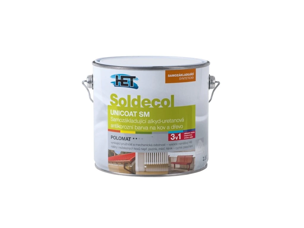 Soldecol Unicoat SM samozákladující alkyd-uretanová polomatná antikorózní barva na kov a dřevo vhodná pro venkovní i vnitřní nátěry železných a neželezných kovů (pozink, měď, hliník apod.) příp. dřevěných povrchů.