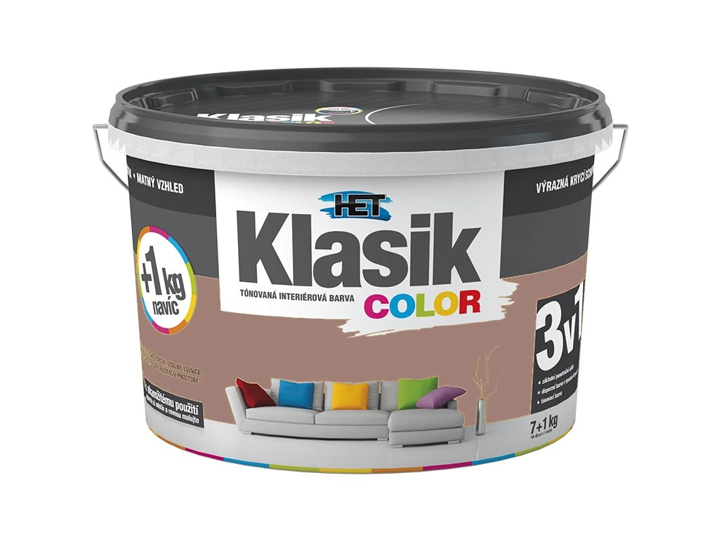 Het Klasik COLOR je kavlitní tónovaná disperzní barva, vhodná pro obývací a komerční prostory, dětské pokoje, jídelny, chodby, kanceláře, prodejní prostory.