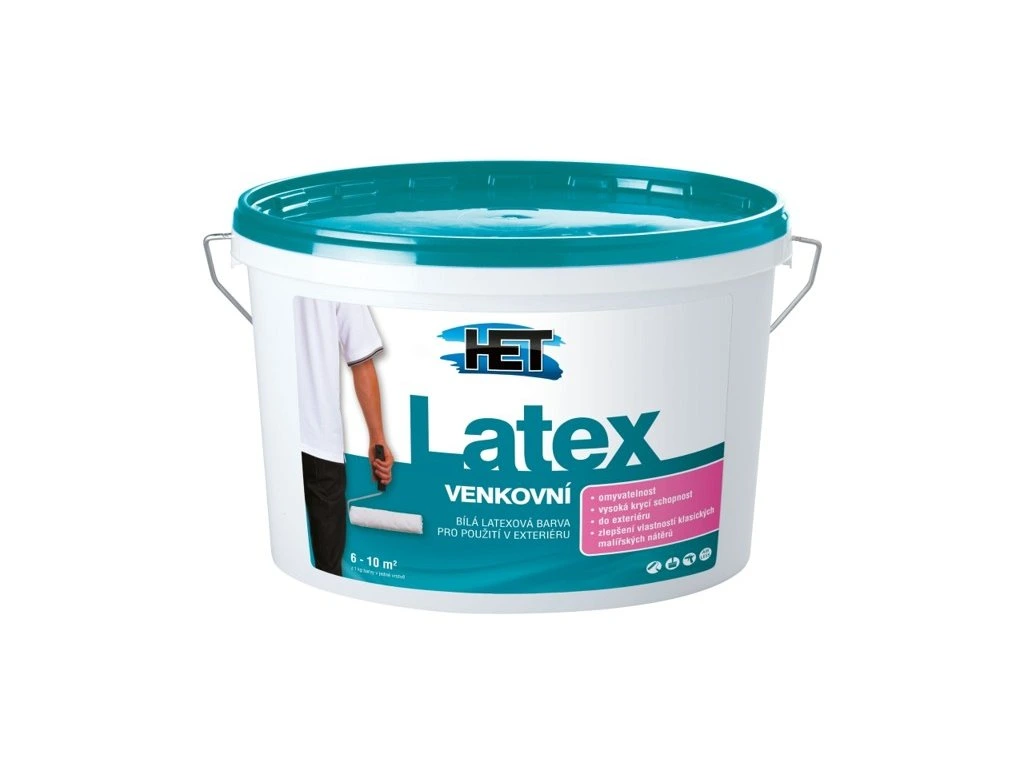 Het Latex venkovní Bílá latexová barva pro použití do exteriéru vhodná pro užitkové a hospodářské prostory v exteriéru, sklady, sokly, nenáročné aplikace, je-li požadován omyvatelný povrch.