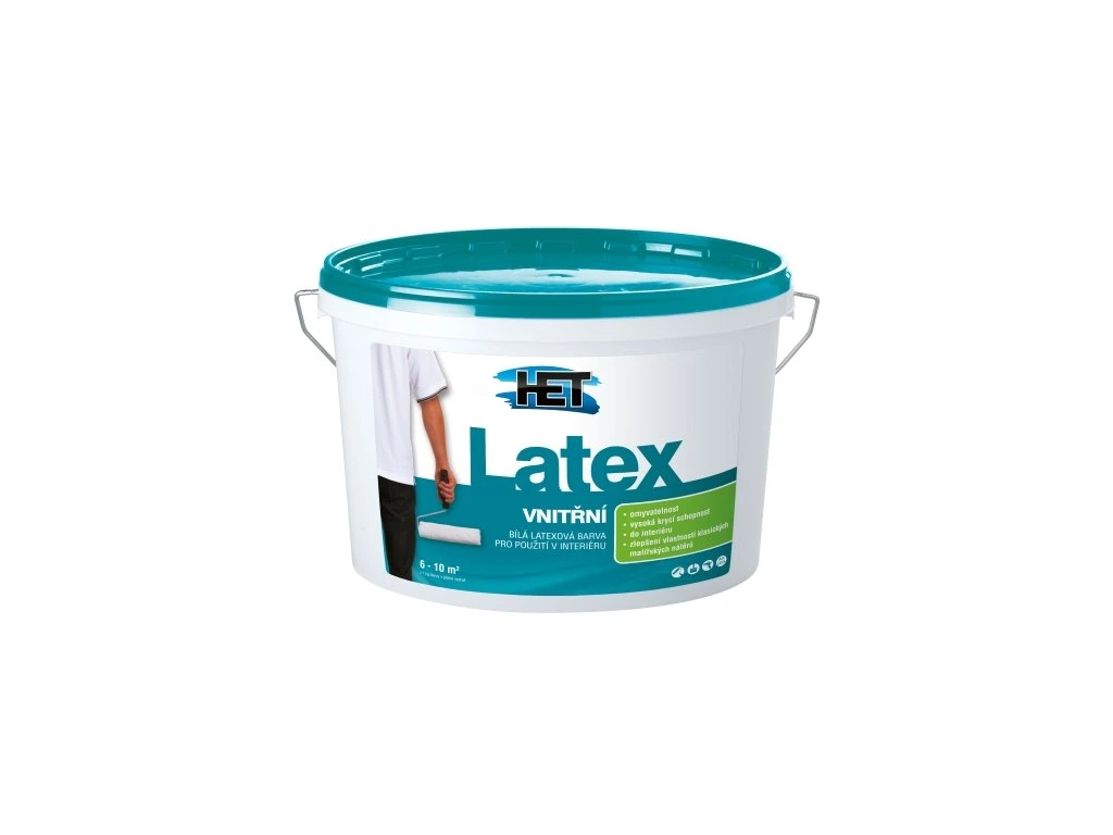 Het Latex vnitřní bílá latexová barva pro použití v interiéru, vhodná pro užitkové a hospodářské prostory v interiéru, sklady, sokly, nenáročné aplikace, je-li požadován omyvatelný povrch.