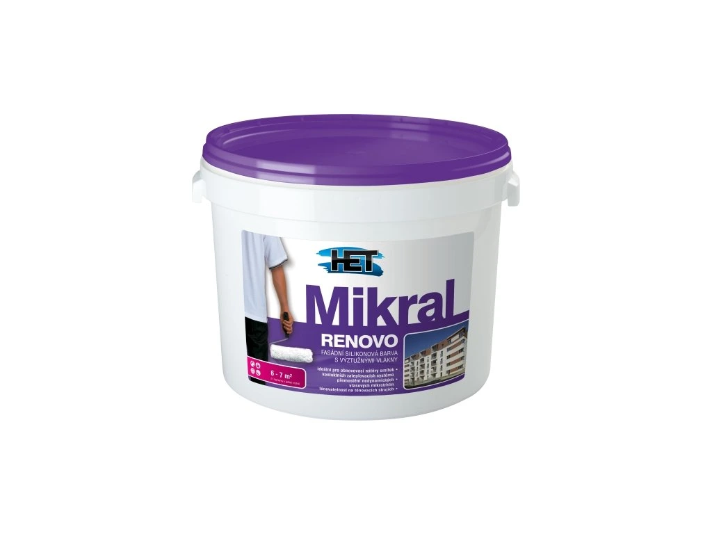 Het Mikral Renovo Acrive fasádní silikonová barva s výstužnými mikrivlákny ošetřená biocidním přípravkem, doporučeno pro fasády a zateplovací systémy s požadavkem vodoodpudivosti nátěru a na přemostění mikrotrhlin.
