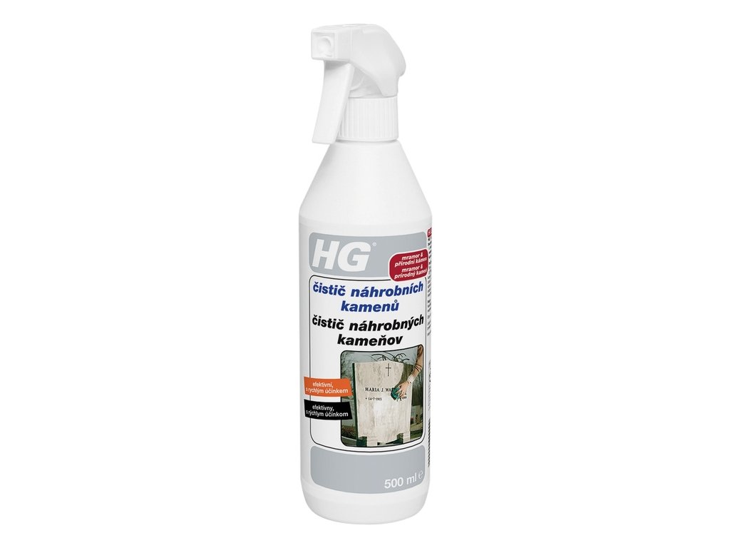 Pusobením povetrnostních vlivu vznikají na prírodním kameni, jemné omítce, zdech atd. plísnové skvrny jako mechový a rasový porost. HG čistič náhrobních kamenu odstranuje bez námahy zažrané necistoty. HG sprejový čistič náhrobních kamenu nanášejte ze vzdálenosti 5 cm na znecištený povrch a nechte vsáknout po dobu 25 minut. Prípadné zbývající necistoty odstrante hadríkem nebo kartácem. Potom povrch opláchnete dostatecným množstvím vody. Pri obzvlášt zažraném znecištení postup po asi 30 minutách zopakujte. Pul litru stací na plochu 3 m2.