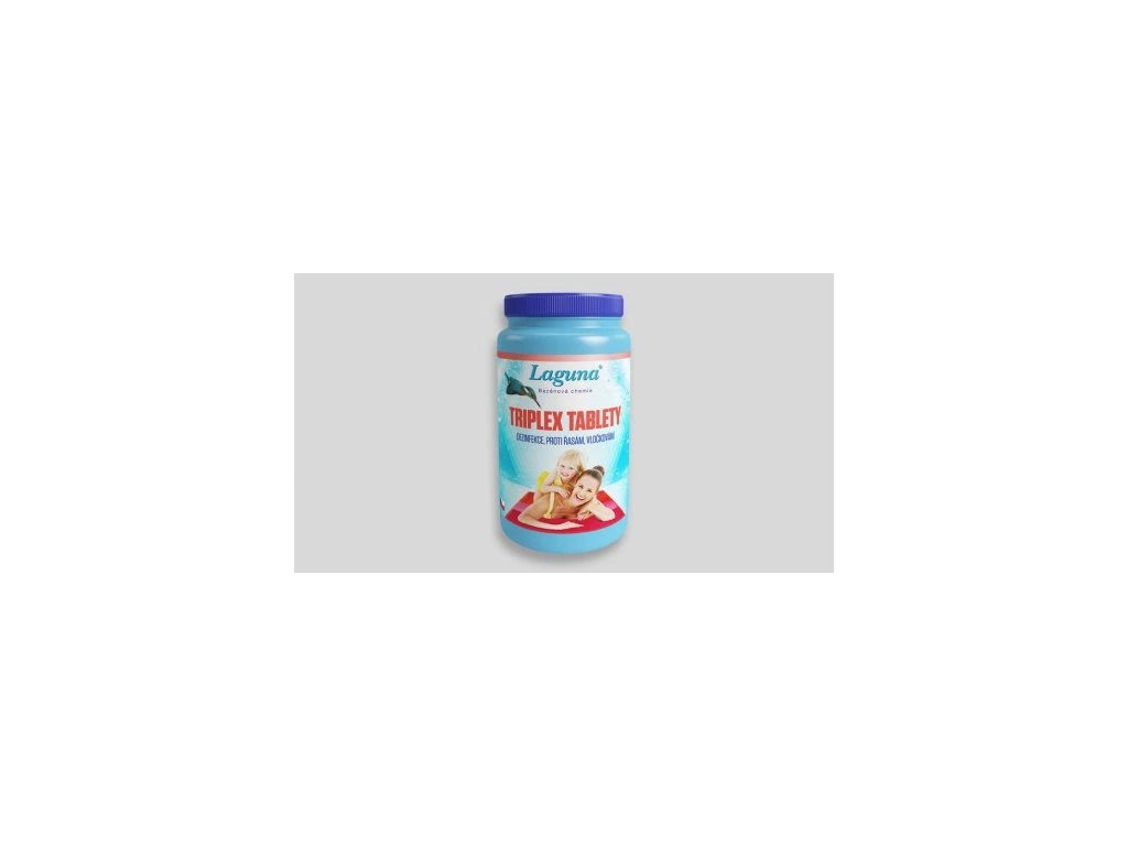 Laguna Triplex tablety Víceúčelový přípravek (200g tableta) je určen k pravidelné dezinfekci bazénové vody. Použití: Přípravek s trojím účinkem zajišťuje dezinfekci bazénové vody pomocí pomalu se uvolňujícího chloru, prevenci proti tvorbě řas a napomáhá odstranění mikroskopických nečistot pomocí flokulace. Použitím této 200g tablety lze ošetřit vodu v bazénu o velikosti 30 m3 na 5–7 dní při běžných podmínkách. Návod k použití: Tableta se dávkuje do skimmeru, nesmí přijít do přímého styku s obklady, stěnou a dnem bazénu, aby nedošlo k jejich odbarvení. Vydatnost: Při pravidelném provozu 1 tableta na 30 m3 vody každých 5–7 dní. „Používejte biocidy bezpečným způsobem. Před použitím si vždy přečtěte označení a informace o přípravku“ Spotřeba: Při pravidelném provozu 1 -2 tablety na 30m3 vody každých 6 - 8 dní. Balení: 1; 1,6; 2,4; 5; 10 kg