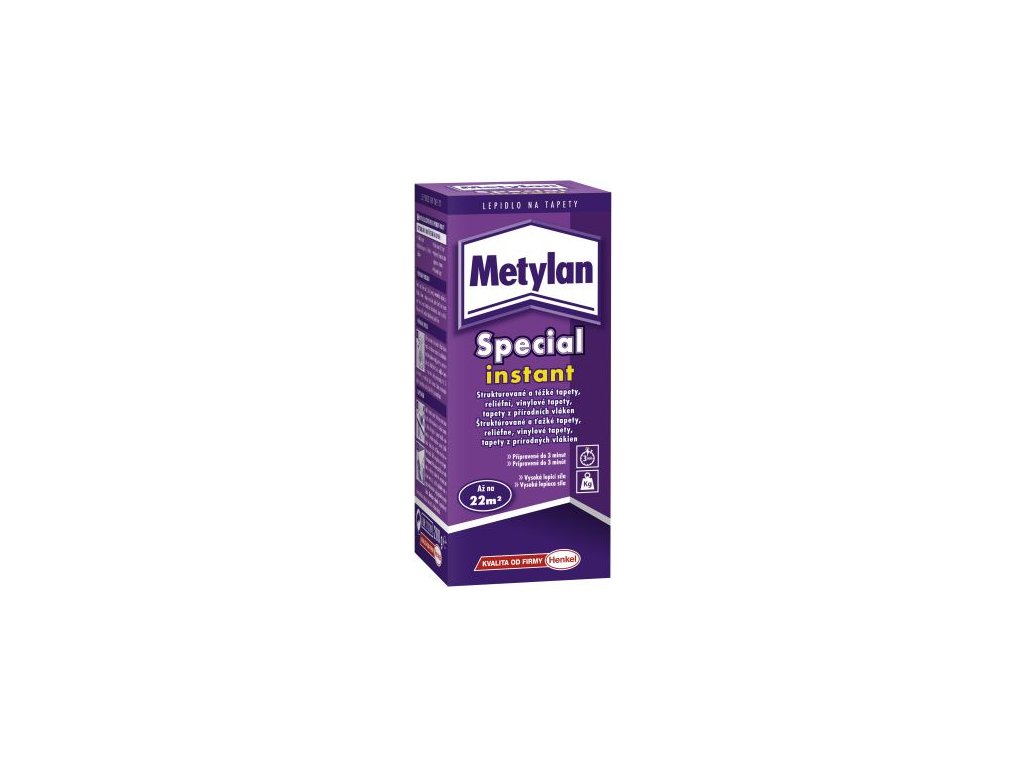 Metylan Special Instant na lepení těžkých papírových tapet, strukturovaných, vynilových, textilních tapet a tapet z přírodních vláken. Obsahuje protiplísňovou složku. Vlastnosti: - připravené k použití během 3 minut - zvláště vydatné - vysoká lepivost - vysoká pevnost za mokra - vysoká počáteční přilnavost, při opravách možnost posunutí - odolné vůči změnám teploty, proti vápnu a cementu - lehce se míchá, lehce nanáší - homogenní konzistence - tapetování s jistotou Vhodné na lepení: - těžkých papírových tapet - vzorovaných (ražených) tapet - lisovaných tapet (např. anaglypta) - surových vláken - strukturovaných tapet, - vynilových tapet (PVC tapet kašírovaných papírem) - tapet z přírodních materiálů (např. tráva, dřevo, korek, juta, hedvábí, špagáty) - fototisků - teky, textilních tapet - kotoučových makulatur (štěpitelné). Balení 200 g