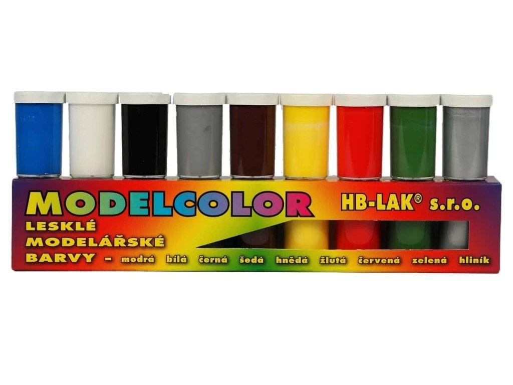 Modelcolor je sada vodou ředitelných krycích barev v odstínech modrá-bílá-černá-šedá-hnědá-žlutá-červená-zelená a hliník.