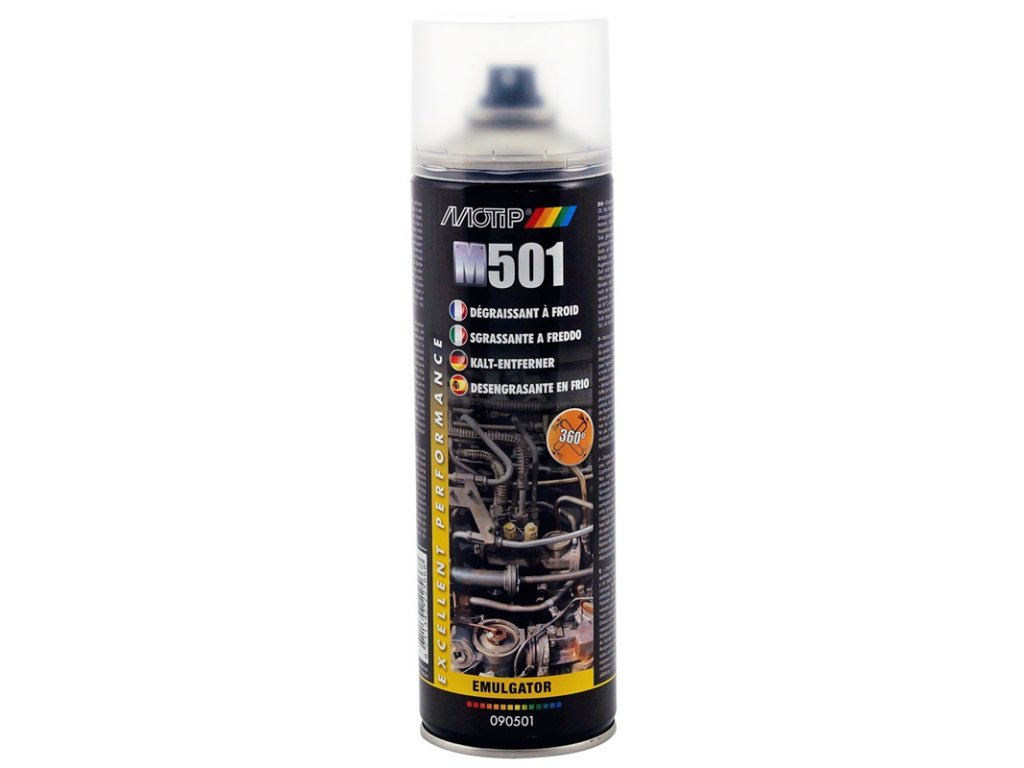 Motip Čistič motoru omyvatelný emulgační čisticí prostředek k odstranění různých znečištění (olej, mastnota, vosk, ochranný nátěr spodku vozu, tér) z ošetřených i neošetřených kovových povrchů.