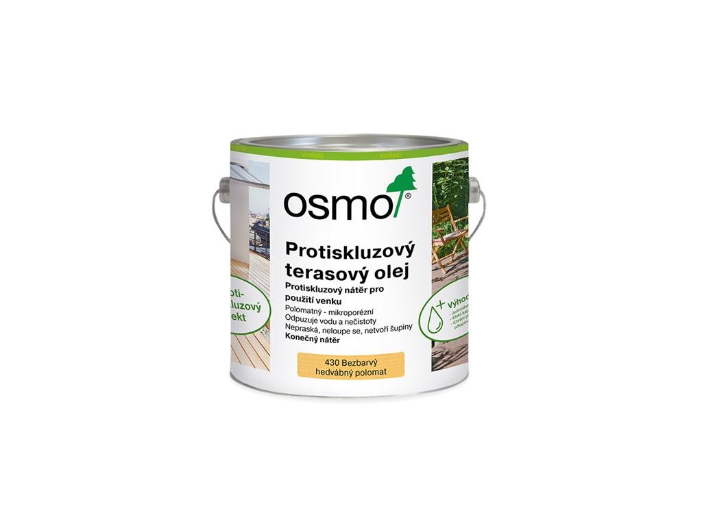 Polomatný konečný nátěr na terasové dřevo nebo jiné dřevěné plochy již předtím barevně upravené pigmentovým olejem. Obsahuje speciální, vysoce zhuštěné organické protiskluzové přísady, které jsou rovnoměrně rozděleny v nátěru a po uschnutí působí protiskluzově s efektem protiskluzu ca. R 10. Na bázi přírodních rostlinných olejů, odpuzuje vodu. Nátěr obsahuje účinné látky k preventivní ochraně proti napadení plísní, řasou a houbou. Neodprýskává, nepraská a neodlupuje se. Bez obrušování jednoduše přetřít. S otevřenými póry, snižuje bobtnání a smršťování dřeva. Aplikuje se snadno a bez znatelných okrajů. Při natírání nezasychá.