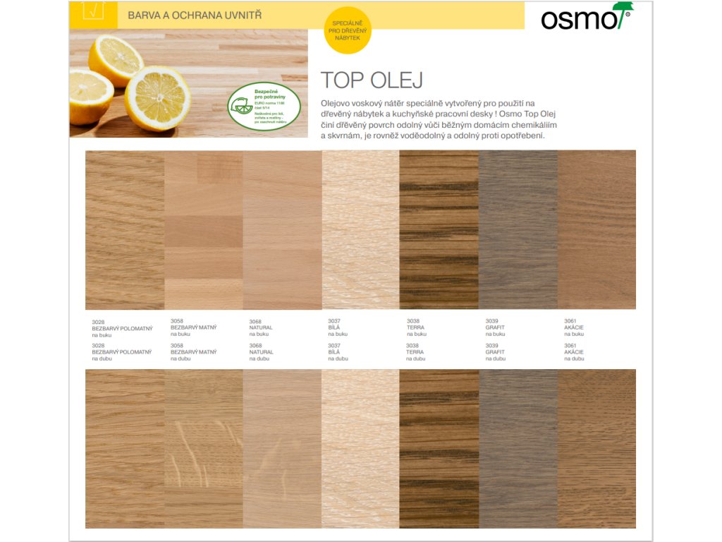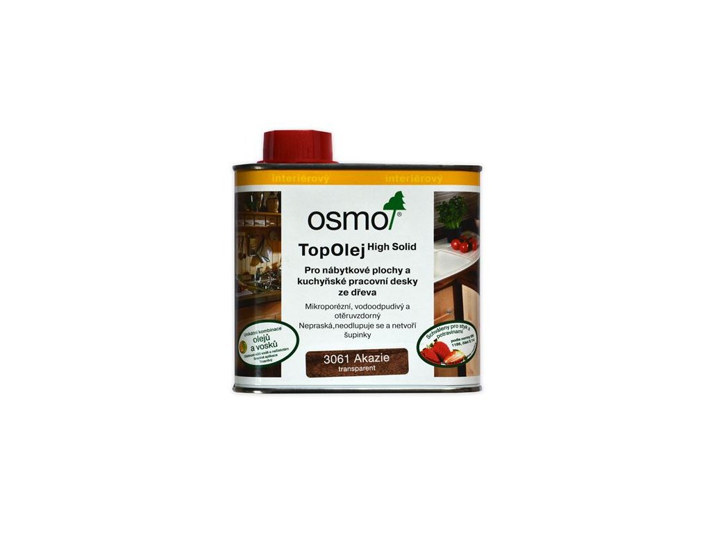 Bezbarvá nebo transparentní nátěrová hmota kombinující přírodní oleje a vosky pro úpravu dřevěného nábytku a dřevěných kuchyňských desek. Osmo Top Olej je nátěrovou hmotou na dřevo na bázi přírodních olejů a vosků, mikroporézní povrch nepraská, neodlupuje se a netvoří šupinky.