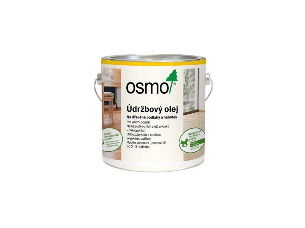 Osmo Údržbový olej zajišťuje hloubkovou péči i běžnou údržbu olejovaných podlah. Zašlé a matné podlahy Osmo Údržbový olej oživí. Při včasném použití Osmo Údržbového oleje (neošetřené dřevo nesmí být vystaveno okolním vlivům) zabráníte pracnému broušení a nutnosti provádět renovační nátěry.