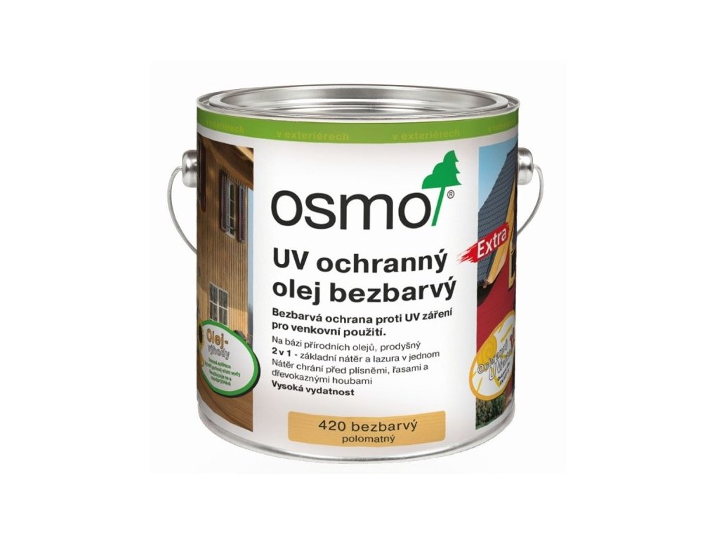 Osmo UV Ochranný olej č. 410 je bezbarvý polomatný ochranný nátěr na dřevo na bázi přírodních olejů k použití ve vnitřních i vnějších prostorách. Je prodyšný, umožňuje dřevu dýchat a snižuje bobtnání a sesychání dřeva. Odpuzuje vodu. Neodprýskává se, nepraská, neodlupuje se a netvoří puchýřky. Je pro lidi, kteří vyznávají zdravý styl života a upřednostňují dřevo povrchově ošetřit výrobkem, který neobsahuje žádné biocidní účinné látky.