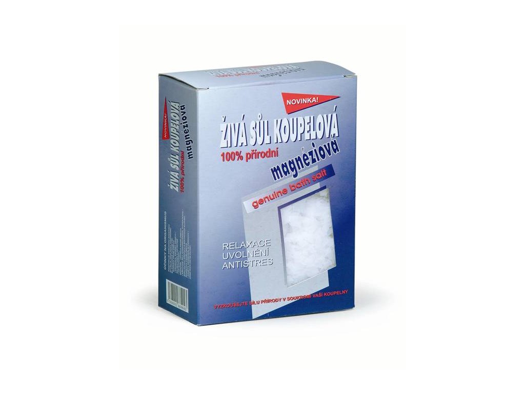 Regina Živá sůl magnesiová Podporuje nervou soustavu, zvyšuje odolnost organizmu, blahodárně působí při: kožních problémech (psoriáza, ekzémy, záněty), revmatismu a artritidě, srdečně cévních problémech (křečové žíly, ateroskleróza, hypertenze), svalových křečích a bolestech kloubů, ženských problémech (záněty, hormonální poruchy) a zánětech ústní dutiny. Použití jako koupel: na jednu vanu /cca 50 litrů vody s teplotou 38-45°C/ přidáme 250 g živé soli. Délka koupele je 15-25 min. Po ukončení koupele nepoužívejte mýdlo ani šampon. Opláchněte tělo čistou vodou a ještě asi hodinu zůstaňte zabaleni v teple, čímž zvýšíte účinek živé soli. Koupel doporučujeme aplikovat 2-3 krát týdně. Použití jako obklad: Do nasyceného roztoku /cca 250 g živé soli rozpustíme ve 2 L vody/ namočíme gázu nebo vatu a přikládáme na postižené místo. Necháme působit 15-25 min.. Doporučujeme aplikovat 2-3 krát týdně. Ani několikanásobné překročení denního limitu hořčíku/cca 300 mg/ zdravému člověku neuškodí, protože nadbytečné množství se z těla samo vyloučí. Složení: MgCI2 427g/l, Mg 109g/l, Chloridy 320 g/l, Na 1205 mg/l, Bromidy 8282 mg/l, B 65 mg/l, K 677 mg/l, Ca 199 mg/l, Sr 7,1 mg/l, ph: 4,92. Upozornění: V případě hypertenze doporučujeme konzultovat teplotu koupele se svým ošetřujícím lékařem. Obsah: 500 g