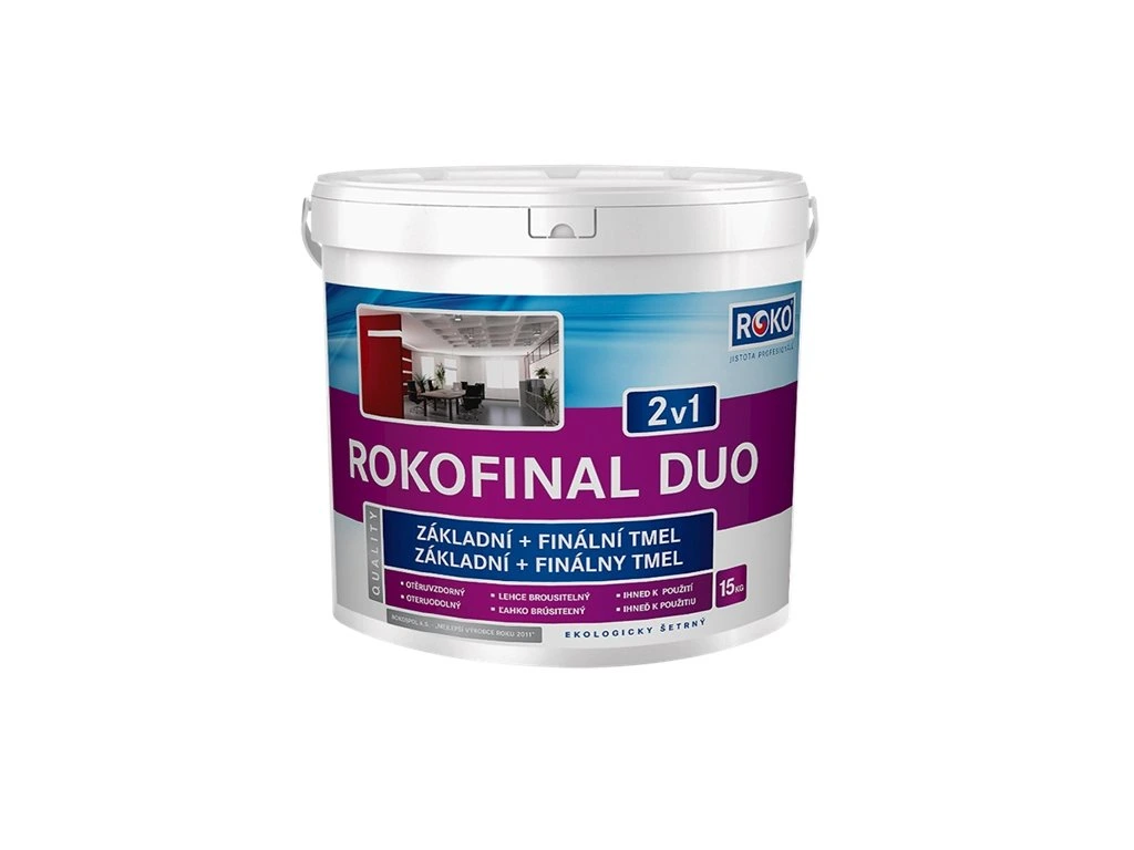 Rokofinal Duo je unniverzální tmel pro profesionály. Jemný pastový finální a spárovací (2v1) tmel pro vnitřní použití.