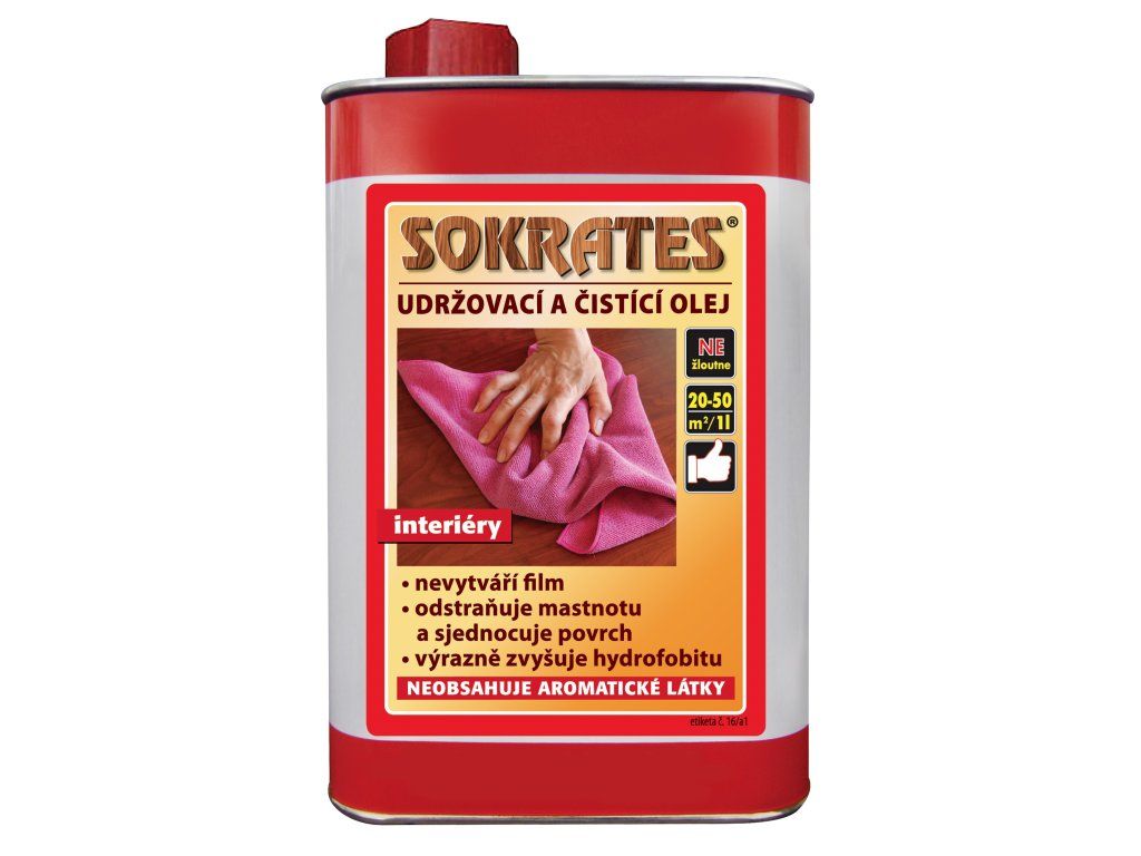 Udržovací a čistící olej je součástí základní péče o plochy ošetřené oleji a olejovosky. Je určen k pravidelné údržbě všech olejovaných ploch. Zejména pak k pravidelnému ošetřování silně namáhaných podlah, jako jsou vstupní prostory, chodby, dveřní průchody, pracovní plochy stolů, úchopová místa a podobně. Přirozeným způsobem odstraňuje špínu, mastné skvrny, skvrny od alkoholu. Snižuje stopy, které vznikly dlouhodobým působením nezasychajícími oleji – živočišné oleje, motorové oleje, opalovací oleje a podobně. Zahlazuje škrábance a rýhy. Po nanesení oleje dochází k výraznému sjednocení vzhledu povrchu. Vylepšuje elasticitu a oděruvzdornost voskového filmu, aniž by zvětšoval tloušťku filmu. Zásadním způsobem zvyšuje hydrofobitu povrchu. Nanášení: Sokrates® Ošetřovací a čistící olej se aplikuje hadrem, houbičkou, špachtlí, stříkáním a stahováním povrchu při minimální teplotě nátěrové hmoty, vzduchu i podkladu od 20 °C. Ředidlo: neředí se Čištění nářadí: terpentýn Vydatnost: 20 - 40 m2 / 1 kg Barevné provedení: čirý Balení: 0,75 L a 2,5 L